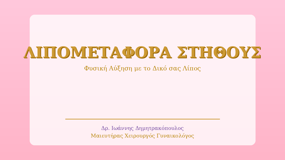Η λιπομεταφορά στήθους (Fat Transfer Breast Augmentation) είναι μια σύγχρονη χειρουργική τεχνική που χρησιμοποιεί το δικό σας λίπος από άλλες περιοχές του σώματος (κοιλιά, μηροί, γλουτοί) για να αυξήσει τον όγκο και να βελτιώσει το σχήμα του στήθους.