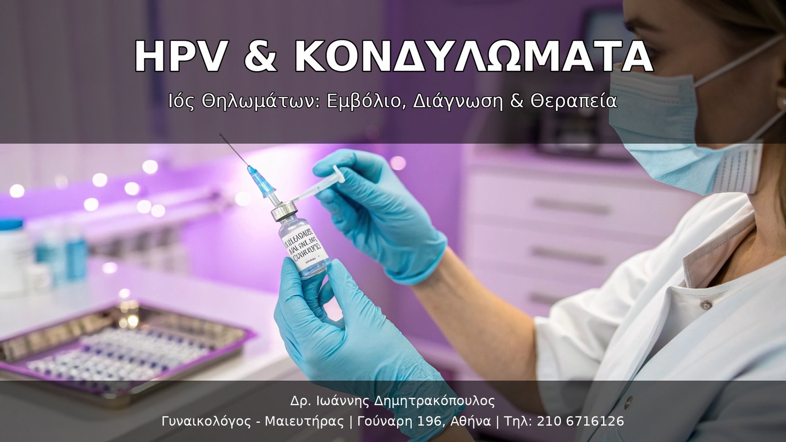 Ο Ιός των Ανθρωπίνων Θηλωμάτων (HPV) είναι μία εξαιρετικά συχνή σεξουαλικώς μεταδιδόμενη λοίμωξη που μπορεί να προκαλέσει τόσο καλοήθεις βλάβες (κονδυλώματα) όσο και προκαρκινικές και καρκινικές αλλοιώσεις. Ευτυχώς, με τον εμβολιασμό, τον τακτικό προληπτικό έλεγχο και την έγκαιρη θεραπεία, ο κίνδυνος σοβαρών επιπλοκών μπορεί να μειωθεί δραστικά.