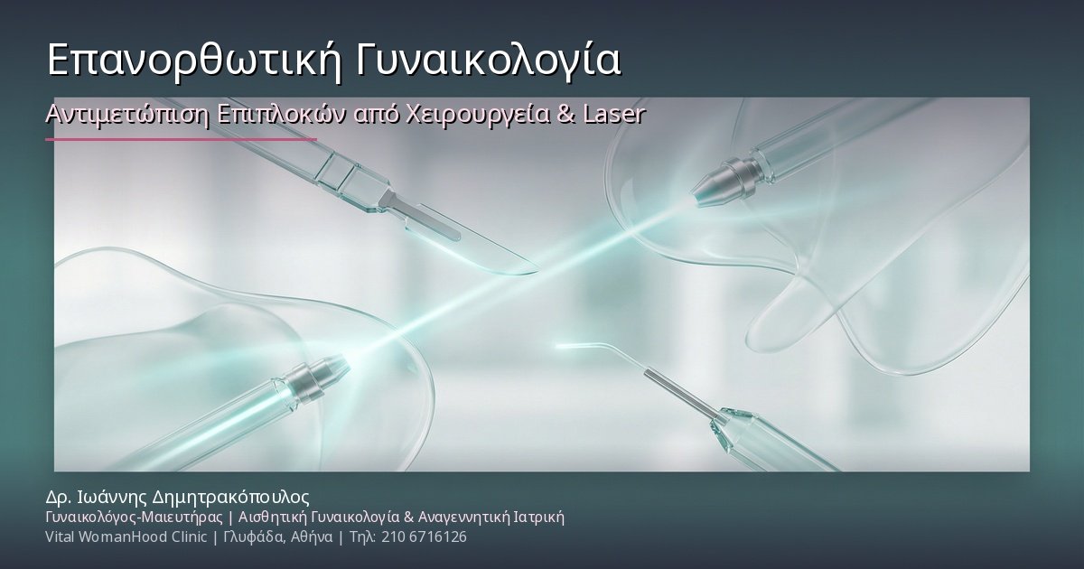 Η αισθητική γυναικολογία και οι laser θεραπείες έχουν μεταμορφώσει τον κόσμο της γυναικείας υγείας και ευεξίας. Ωστόσο, όπως κάθε ιατρική επέμβαση, ενέχουν ρίσκα και πιθανές επιπλοκές. Η επανορθωτική γυναικολογία αποτελεί έναν εξειδικευμένο κλάδο που ασχολείται αποκλειστικά με την αντιμετώπιση αυτών των επιπλοκών — χωρίς νέα χειρουργική επέμβαση, χωρίς νυστέρι, με τα πιο προηγμένα αναγεννητικά εργαλεία που διαθέτει σήμερα η ιατρική επιστήμη.