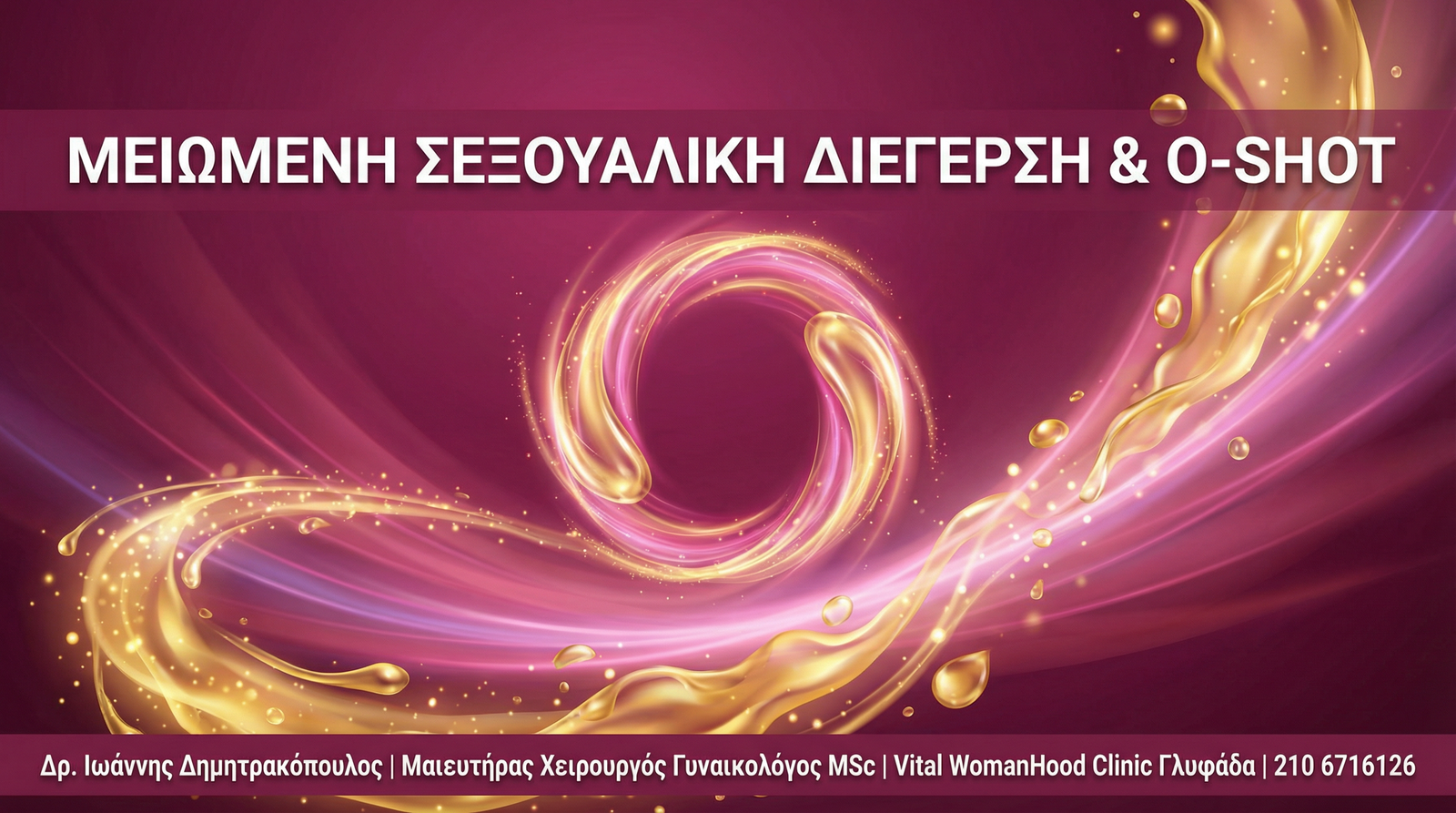 Στη Vital WomanHood Clinic στη Γλυφάδα, ο Δρ. Ιωάννης Δημητρακόπουλος, Μαιευτήρας Χειρουργός Γυναικολόγος MSc Αισθητικής Ιατρικής, εφαρμόζει εξατομικευμένα πρωτόκολλα με βάση το O-Shot (PRP ένεση), G-Spot Augmentation, Εξωσώματα και Ραδιοσυχνότητες (RF), επαναφέροντας τη σεξουαλική διέγερση και ευαισθησία σε γυναίκες όλων των ηλικιών.