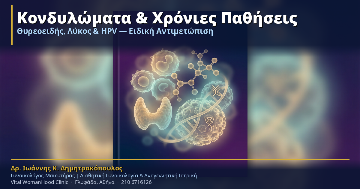 Η συνύπαρξη HPV/κονδυλωμάτων με χρόνιες παθήσεις όπως ο θυρεοειδής, ο ΣΕΛ ή η ρευματοειδής αρθρίτιδα δεν είναι απλή κατάσταση — αλλά αντιμετωπίσιμη με τη σωστή εξειδικευμένη φροντίδα. Το κλειδί βρίσκεται στην έγκαιρη διάγνωση, στη στενή συνεργασία μεταξύ ειδικών και στην εξατομικευμένη θεραπεία που σέβεται τη συνολική κατάσταση της ασθενούς.