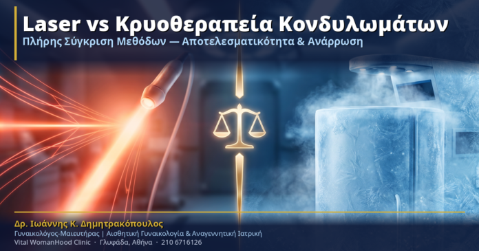 Τα κονδυλώματα αποτελούν μια από τις πιο συχνές σεξουαλικά μεταδιδόμενες λοιμώξεις παγκοσμίως, προκαλούμενα από τον Ιό των Ανθρωπίνων Θηλωμάτων (HPV). Η αντιμετώπισή τους απαιτεί εξειδικευμένη γνώση και εξατομικευμένη προσέγγιση, καθώς δεν υπάρχει μία λύση που να ταιριάζει σε όλες τις περιπτώσεις. Στην Vital WomanHood Clinic στη Γλυφάδα, ο Δρ. Ιωάννης Κ. Δημητρακόπουλος προσφέρει και τις δύο κορυφαίες μεθόδους αφαίρεσης κονδυλωμάτων: το Laser CO2 και την Κρυοθεραπεία. Σε αυτό το άρθρο παρουσιάζουμε μια πλήρη σύγκριση των δύο μεθόδων, ώστε να κατανοήσετε ποια ενδείκνυται για εσάς.