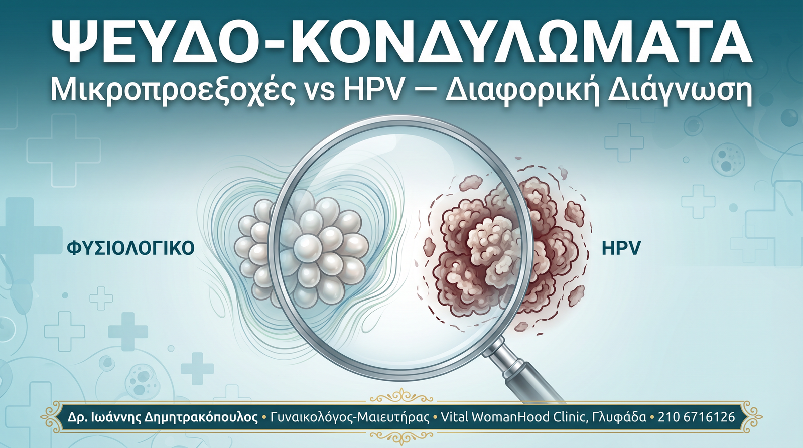 Πολλές γυναίκες ανησυχούν όταν παρατηρούν μικρές προεξοχές στους μικρούς χείλη του αιδοίου, νομίζοντας ότι είναι κονδυλώματα HPV. Στην πραγματικότητα, τις περισσότερες φορές πρόκειται για ψευδοκονδυλώματα (vestibular papillomatosis) — μια φυσιολογική ανατομική παραλλαγή που δεν σχετίζεται με τον HPV. Ο Δρ. Ιωάννης Δημητρακόπουλος, Γυναικολόγος-Μαιευτήρας στη Γλυφάδα, εξηγεί τη διαφορά.